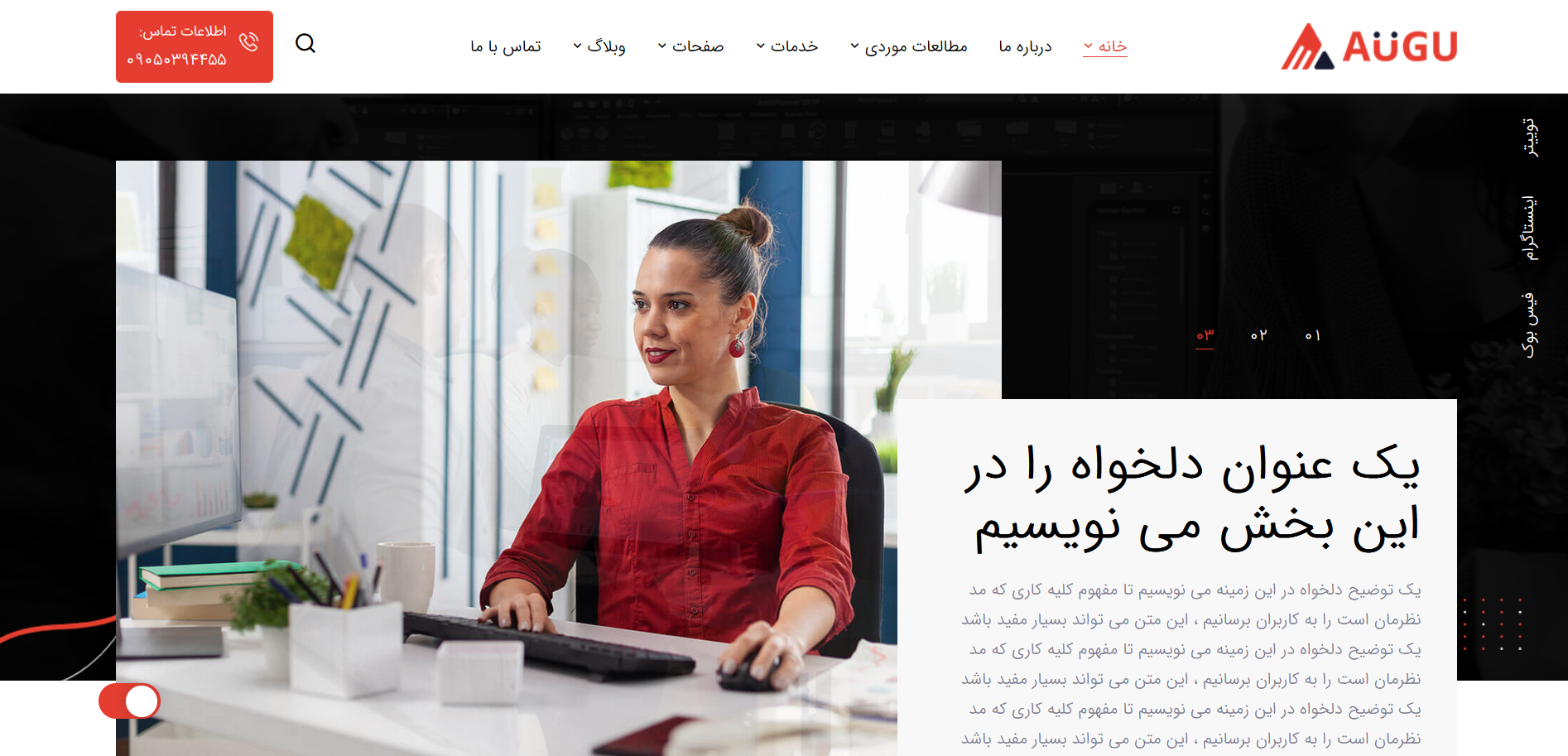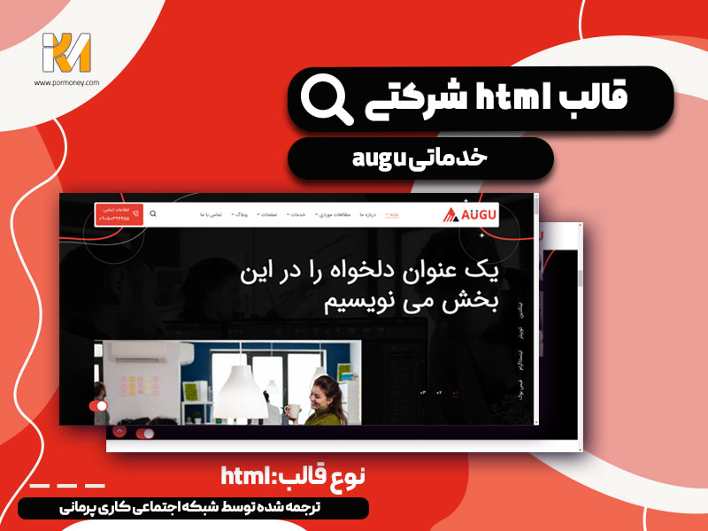 در قسمت پایین تر قالب html شرکتی ، خدماتی ، augu عنوان شرکت را نوشته و یک توصیف مفصل راجع به فعالیت های خود می نویسید و کاربر یا مشتری با زدن بر روی اطلاعات بیشتر می تواند مطالب بیشتری را ببیند در سمت چپ مطالب، گالری پیشرفته از تصاویر شرکت شما و فعالیت های تان وجود دارد