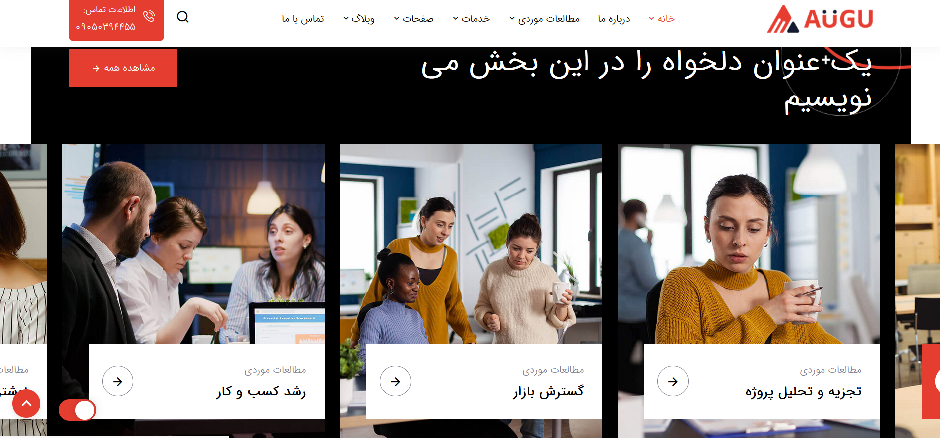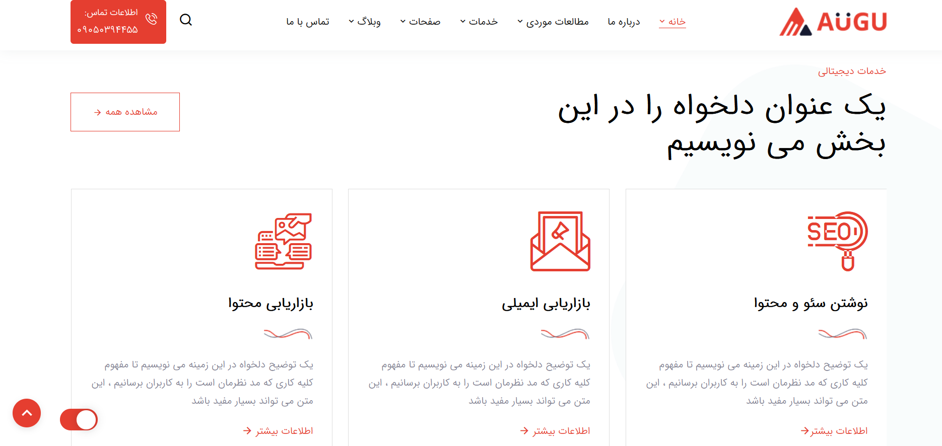 بخش بعدی قالب html شرکتی ، خدماتی ، augu شامل یک عنوان بزرگ درباره فعالیت شما و در قسمت زیرین آن یک قسمت گالری گونه شامل فعالیت ها مثل محصول دیجیتالی، بازاریابی دیجیتال نوشتن سئو و محتوا است که هر کدام شامل توضیح کوتاهی می باشند و با زدن بر روی دکمه اطلاعات بیشتر، مطالب بیشتری را راجع به آن موضوع خواهید دید.