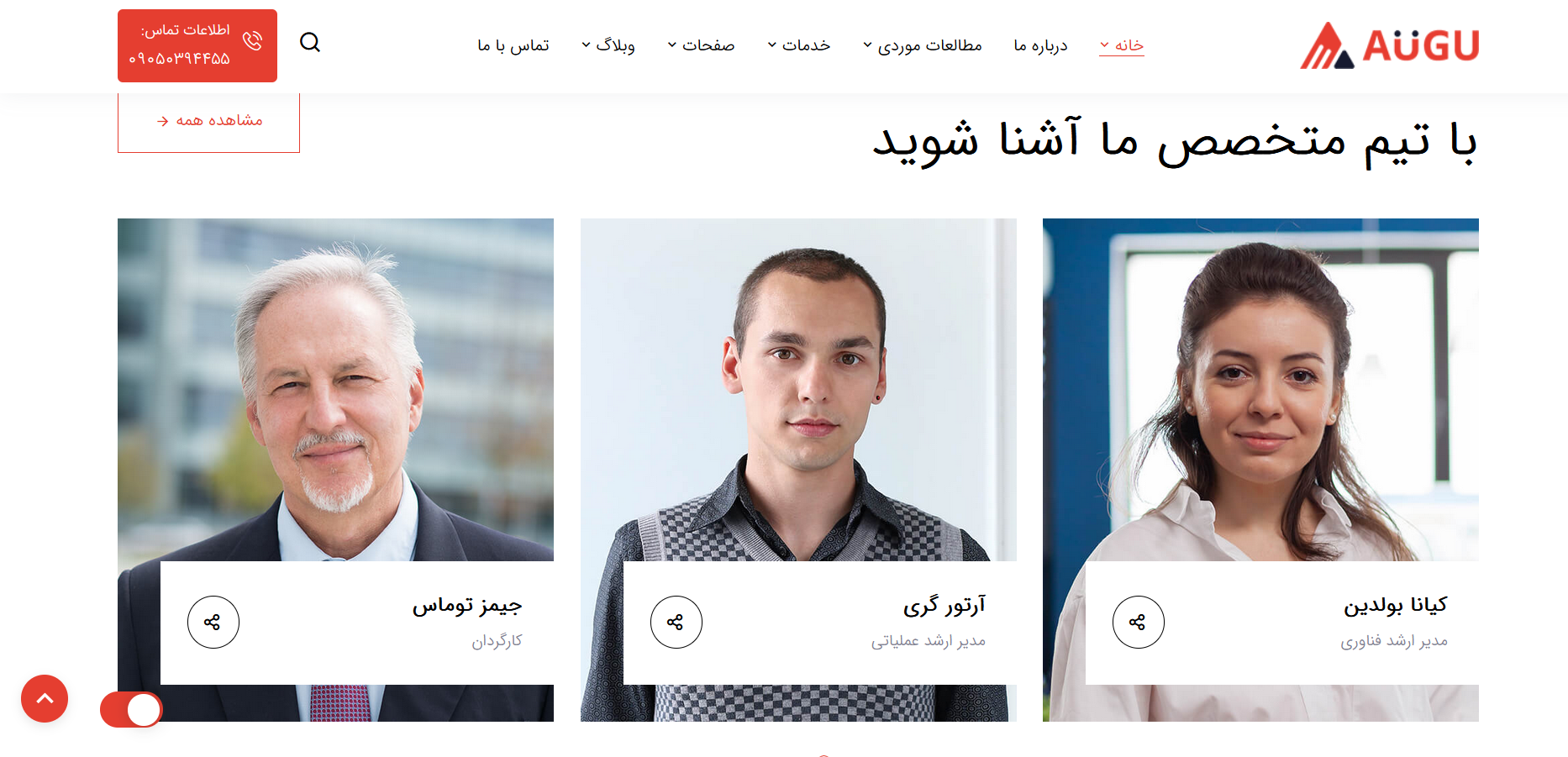 در قسمت بعدی با یک عنوان مناسب و یک گالری تصاویر زیبا تا می توانید همکاران و تیم را معرفی کنید و با نگه داشتن موس روی هر کدام از اعضای تیم راه های ارتباطی با کارمند را میبینید.
