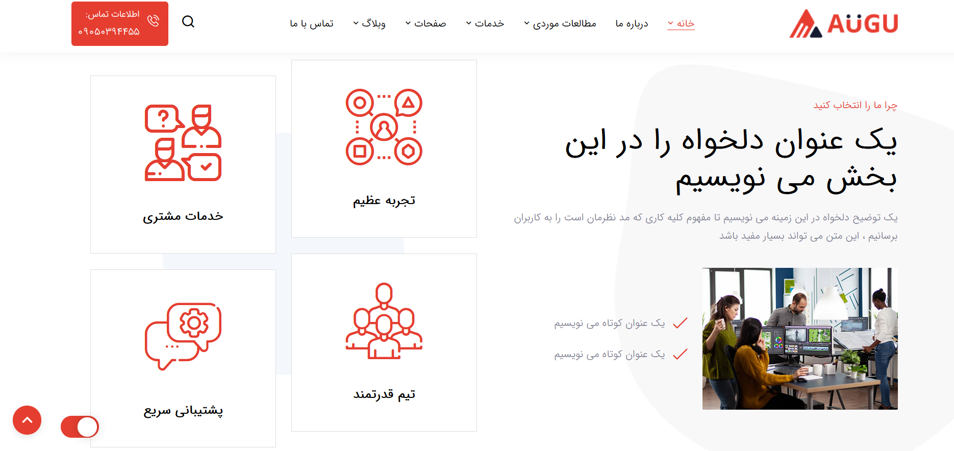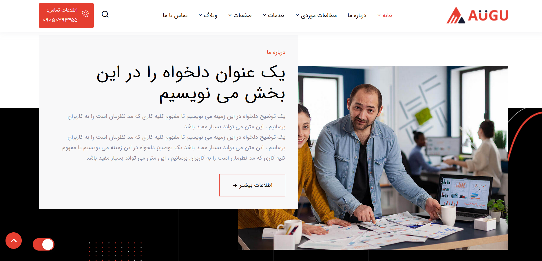 در بخش پایین تر قالب html شرکتی ، خدماتی ، augu دوباره به شما این امکان داده شده تا عنوان سایت خود را بنویسید و یک توصیف مفصل راجع به عنوان شرکت و خدمات خود بنویسید. همچنین با زدن بر روی دکمه اطلاعات بیشتر مطالب بیشتری را شاهد باشید.