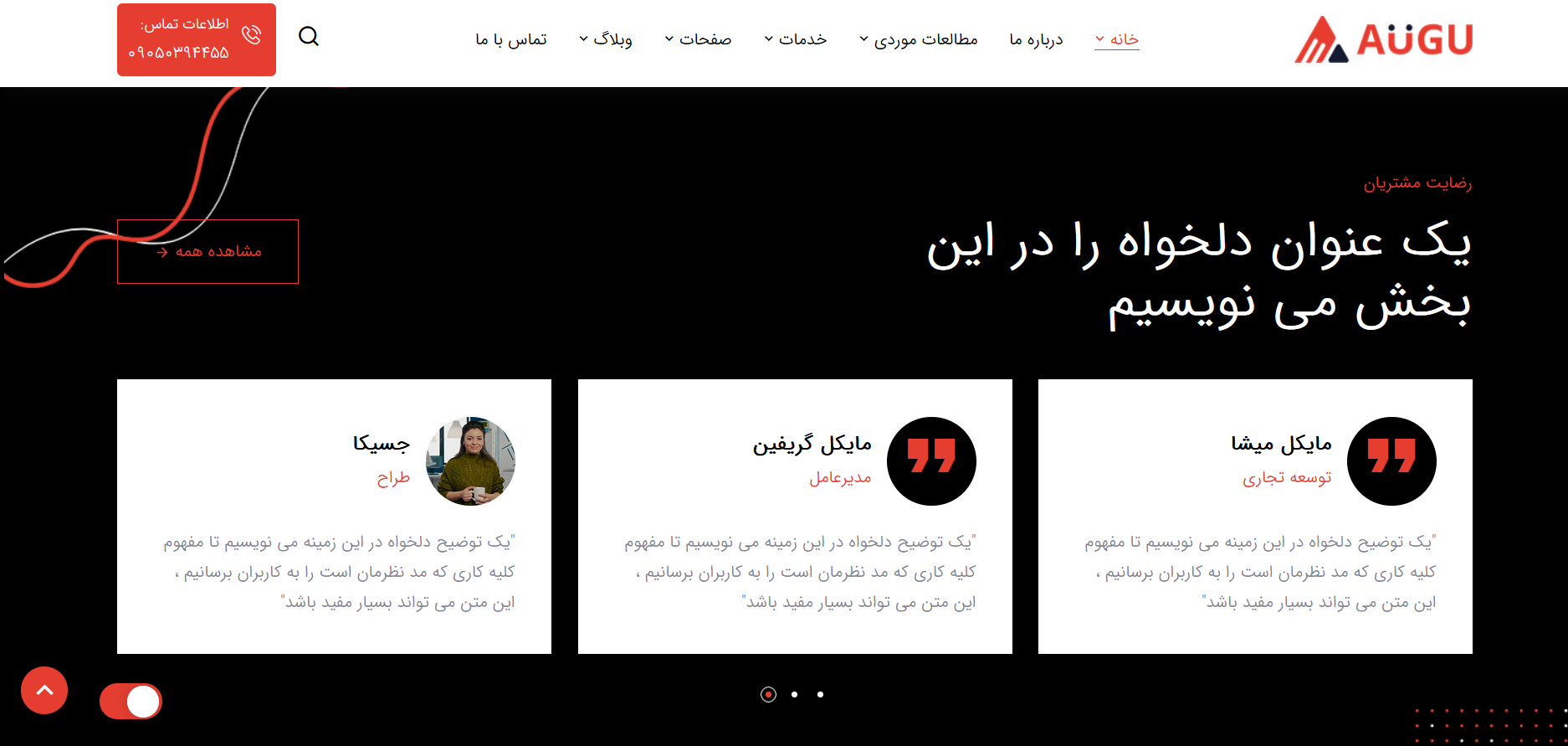 در این قسمت قالب html شرکتی ، خدماتی ، augu به شما این امکان را میدهند که از نظرات مشتریان و کاربران راجع به محصولات خود آگاه شوید و همچنین به مشتریان و کاربران جدید این اطمینان را بدهید که می توانند به وب سایت شما اعتماد کنند و همچنین این اطلاعات را کسب کنند که شما در کدام خدمات حرفه ای تر عمل می کنید