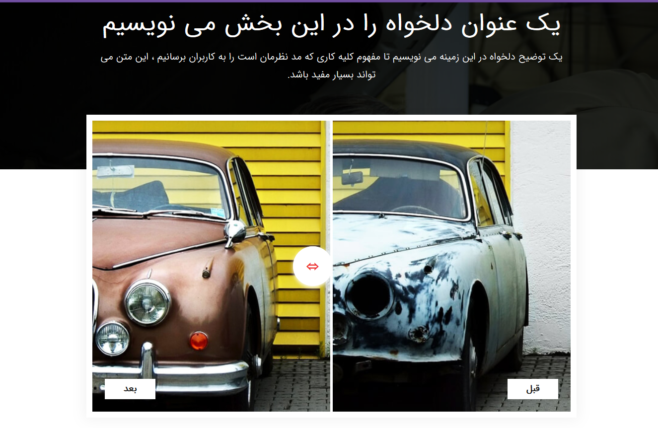 تفاوت را در این قسمت از قالب html خدماتی ،تعمیر خودرو xpart می توانید با نشان دادن یک عکس قبل از شروع به کار و یک عکس پس از تکمیل کار به کاربران نشان دهید تفاوت را برای مشتریانِ و دریافت کنندگان خدمات قابل لمس کنید.