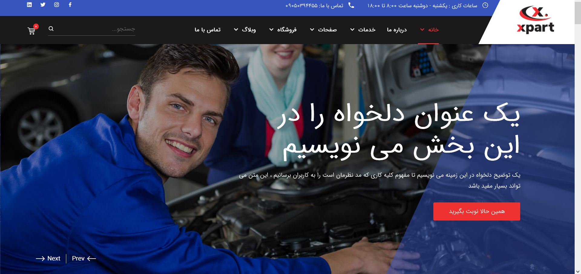 این بخش از قالب html خدماتی ،تعمیر خودرو xpart شامل خانه، درباره ما، خدمات، صفحات، فروشگاه، وبلاگ و تماس با ما است که باعث می شود دسترسی به قسمت های اصلی راحت شود.
