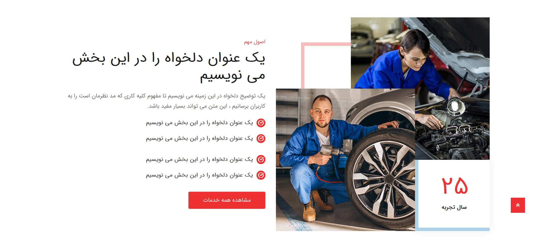 در این قسمت از قالب html خدماتی ،تعمیر خودرو xpart می توانید اصل مهم برند تعمیرات خودروی خود را با یک عنوان مناسب نوشته برای مثال "تعمیر و نگهداری خودرو با کیفیت بالا" و به صورت موردی اصول مهم راجب کارگاه خود را ذکر کنید. همچنین در سمت راست سابقه کار خود را نوشته برای مثال "25 سال سابقه کار" و عکس دلخواه و موثر را در این قسمت قرار دهید.