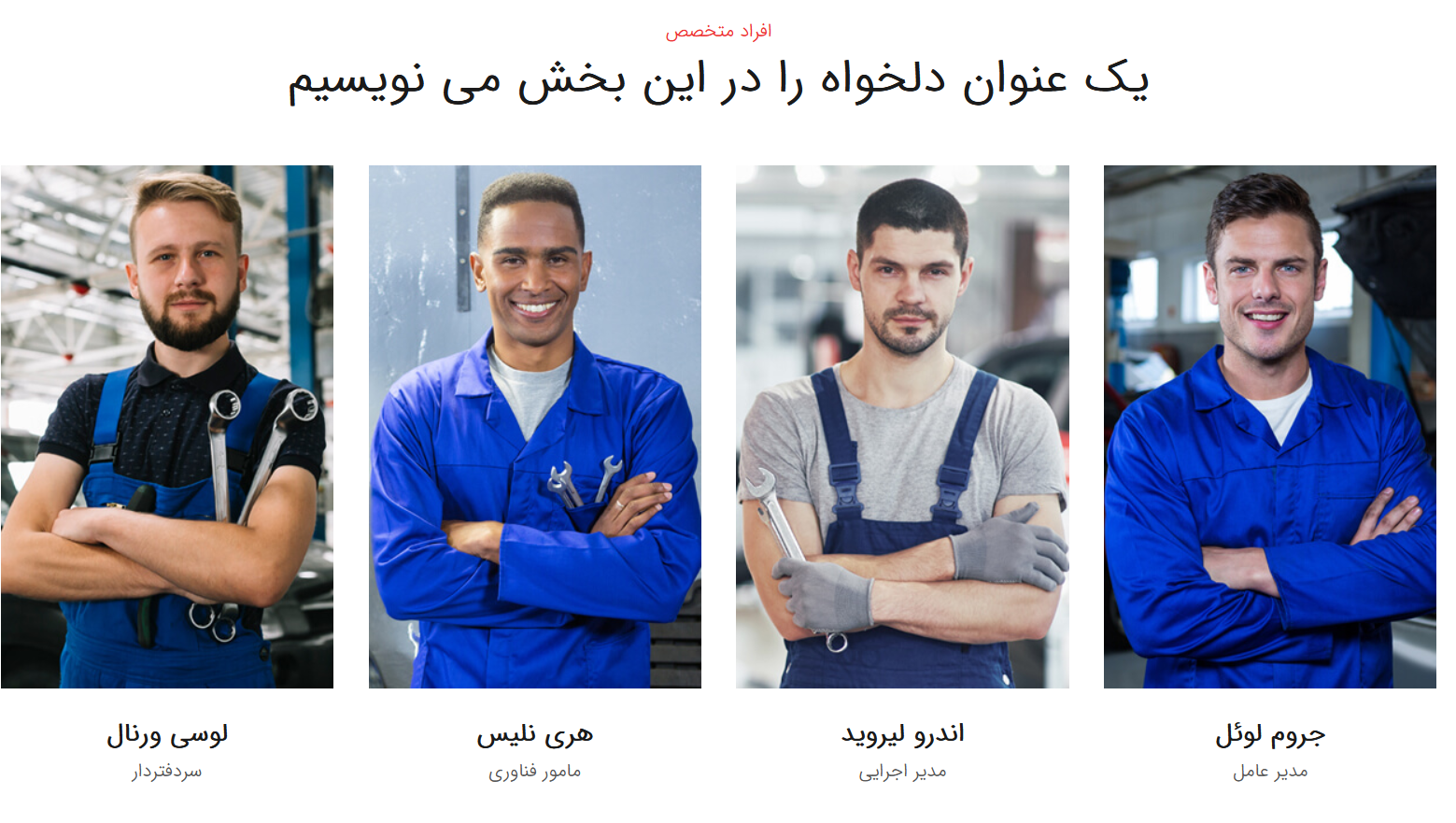 در بخش بعدی از قالب html خدماتی ،تعمیر خودرو xpart می توانید با استفاده از یک گالری تصاویر همکاران را به دریافت کنندگان خدمات نشان دهید و همچنین راه ارتباطی با هر کدام از آنها را ذکر کنید .