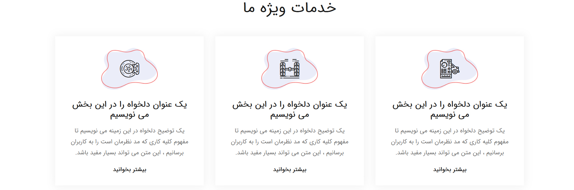 قسمت بعدی از قالب html خدماتی ،تعمیر خودرو xpart شامل خدمات ویژه است که به صورت پست در دسترس است و اگر در کارگاه خود خدمات ویژه ای را به مشتریان یا کاربران ارائه میکنید می توانید در این قسمت آن خدمات ویژه را معرفی کنید و برای هر کدام یک توضیح مختصر بنویسید.