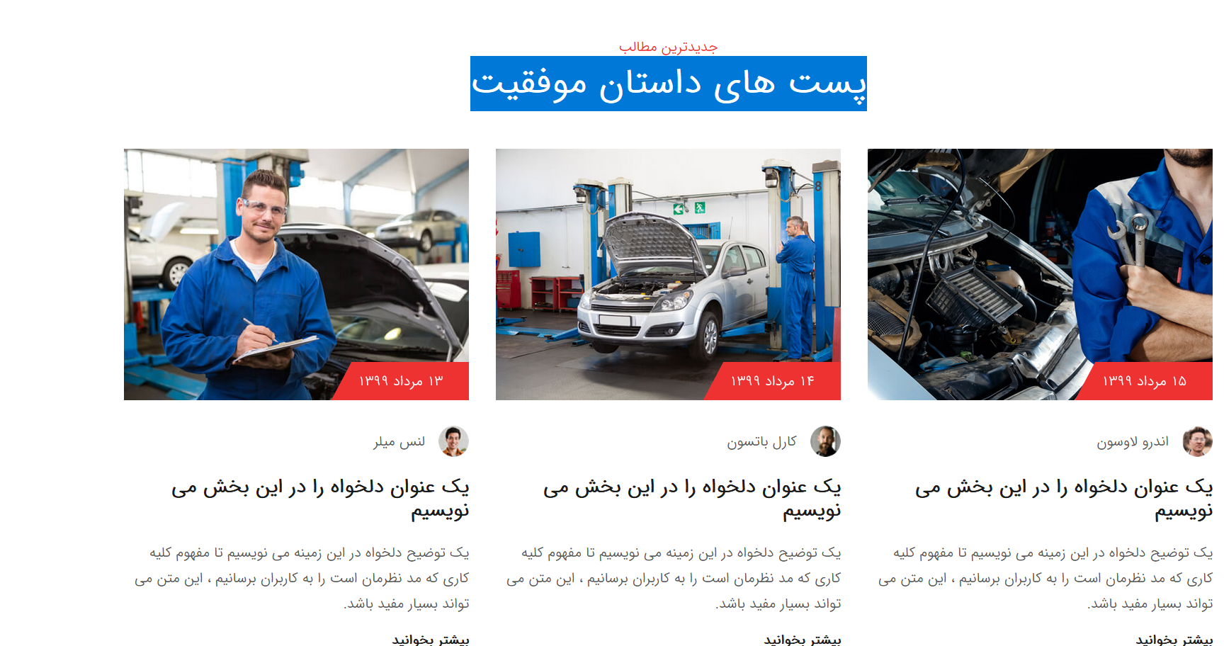 در این قسمت از قالب html خدماتی ،تعمیر خودرو xpart می توانید نمونه کارهای خود را ارائه کنید و اگر در گذشته خدماتی ارائه کردید که چالش برانگیز بوده است و در نهایت با موفقیت انجام شده و تعمیرات لازم را انجام دادید، با استفاده از پست به کاربران نشان دهید و همچنین چنین اقدامی سبب می شود که به کاربران این نکته را القا کنید که هر چقدر تعمیرات آنها سخت باشد شما توانایی برطرف کردن مشکل مشتری را دارید.