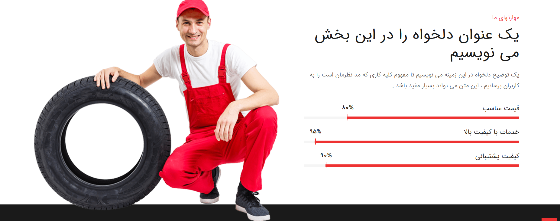 در این قسمت از قالب html خدماتی ،تعمیر خودرو xpart می توانید با یک عنوان مناسب مهارت های خود را ذکر کرده برای مثال "تعمیر خودرو با استفاده از تکنولوژی روز" و آن را به چند بخش تقسیم کنید و به صورت درصدی توانایی خود را به مشتری نشان دهید.